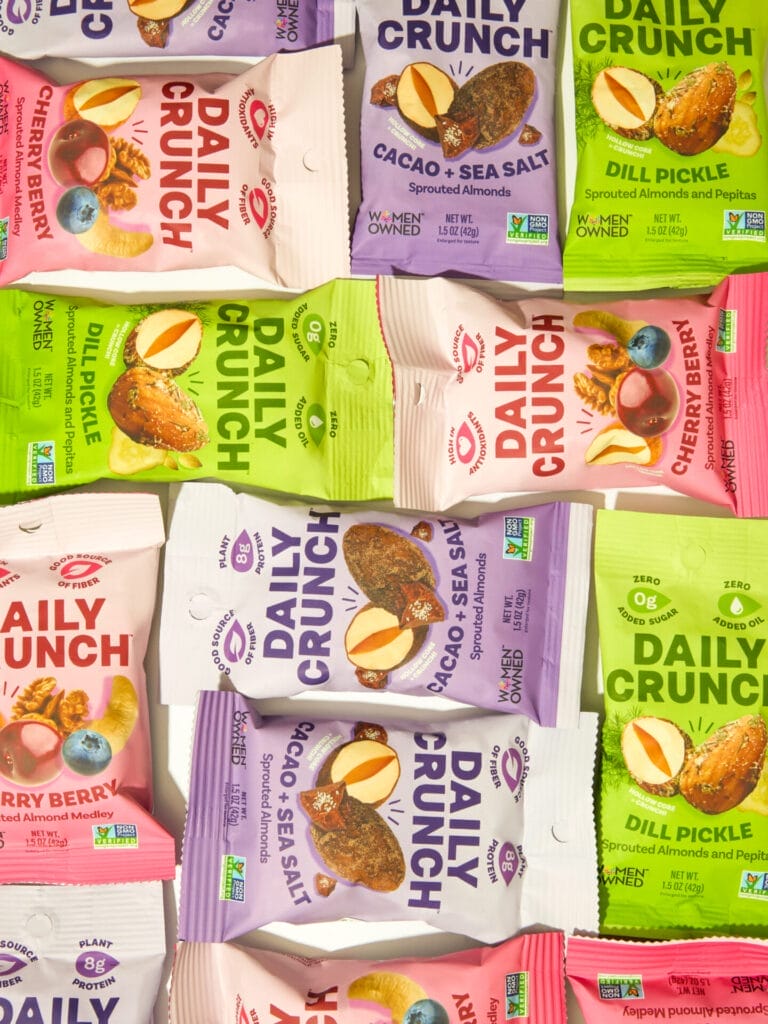 Daily Crunch now offers seven flavors in three sizes, with Dill Pickle Sprouted Almonds + Pepitas leading the pack. Flavor innovation is central to the brand’s identity: the team tracks consumer trends, tests recipes with R&D, and pilots them direct-to-consumer before scaling to retail. This fall, they’ll introduce two new flavors, including a Chai Spiced limited-time offering.